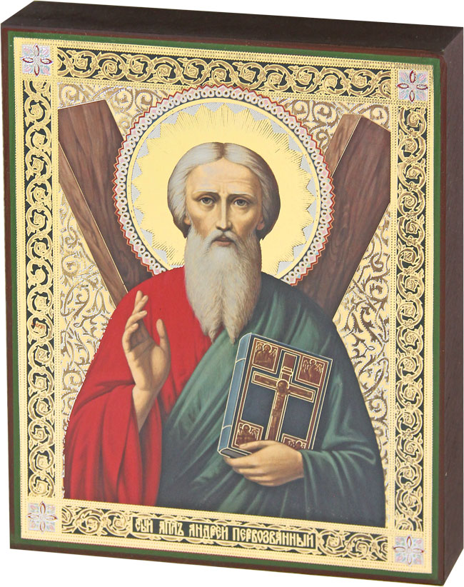 Икона святого Андрея Первозванного выполнена в технике литографии на дереве с двойным тиснением.