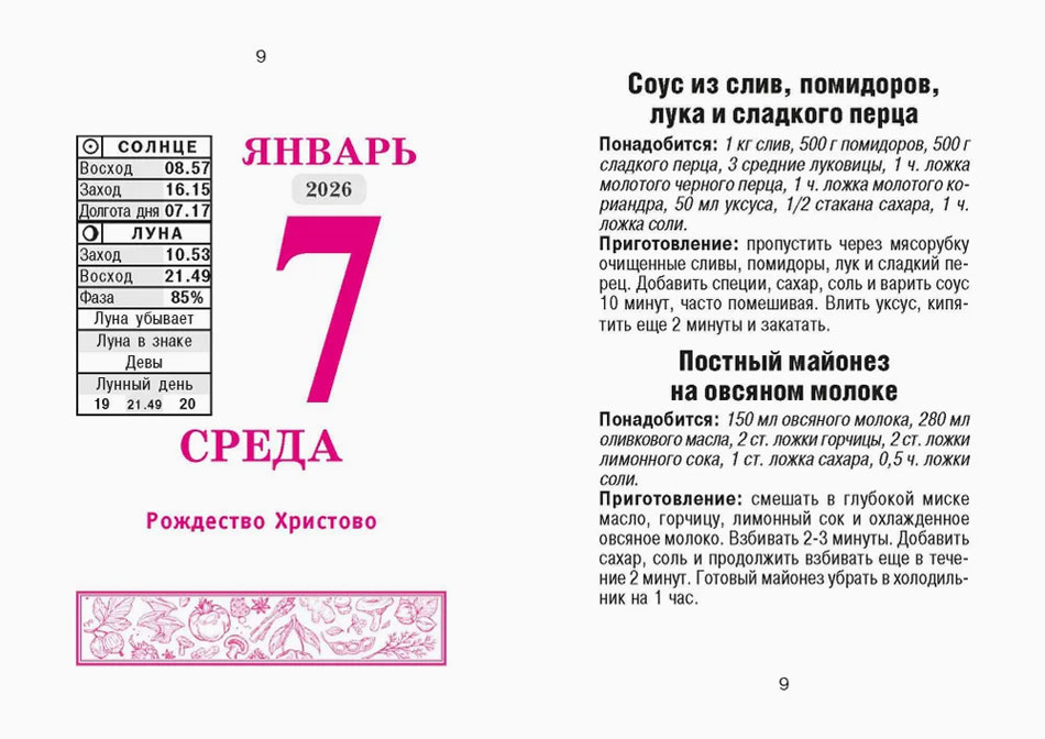 Календарь содержит рецепты заготовок, именины и астрономические данные.