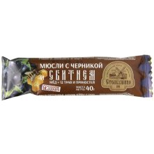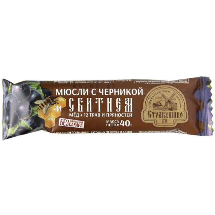 Состав: хлопья не требующие варки: пшеничные, овсяные, ржаные, ячменные; овсяный сироп, изюм, рис воздушный (крупа рисовая), сбитень (мед натуральный, вода, мята, базилик, душица, корица, кориандр, имбирь молотый, гвоздика молотая, корень аира, зверобой, кардамон, мускатный орех, корень солодки, сок лимона), масло подсолнечное дезодорированное, масло какао, черника сушеная, ароматизатор натуральный черника, консервант сорбат калия. Содержит сахара природного происхождения. На предприятии вырабатывается продукция с применением арахиса, яиц, молока и продуктов его переработки, продуктов переработки сои.