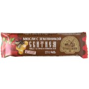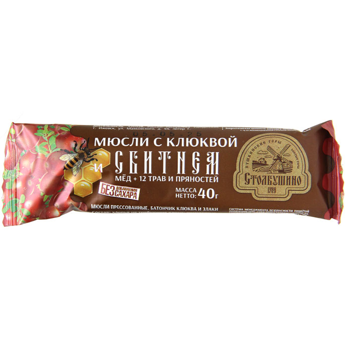 Состав: хлопья не требующие варки: пшеничные, овсяные, ржаные, ячменные; овсяный сироп, изюм, рис воздушный (крупа рисовая), сбитень (мед натуральный, вода, мята, базилик, душица, корица, кориандр, имбирь молотый, гвоздика молотая, корень аира, зверобой, кардамон, мускатный орех, корень солодки, сок лимона), масло подсолнечное дезодорированное, масло какао, клюква сушеная, антиокислитель аскорбиновая кислота, ароматизатор натуральный клюква, консервант сорбат калия. Содержит сахара природного происхождения. На предприятии вырабатывается продукция с применением арахиса, яиц, молока и продуктов его переработки, продуктов переработки сои.