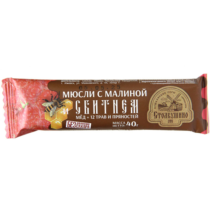 Состав: хлопья не требующие варки: пшеничные, овсяные, ржаные, ячменные; овсяный сироп, изюм, рис воздушный (крупа рисовая), сбитень (мед натуральный, вода, мята, базилик, душица, корица, кориандр, имбирь молотый, гвоздика молотая, корень аира, зверобой, кардамон, мускатный орех, корень солодки, сок лимона), масло подсолнечное дезодорированное, масло какао, малина сушеная, антиокислитель аскорбиновая кислота, ароматизатор натуральный малина, консервант сорбат калия. Содержит сахара природного происхождения. На предприятии вырабатывается продукция с применением арахиса, яиц, молока и продуктов его переработки, продуктов переработки сои.