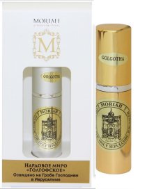 Благовоние с распылителем в подарочной упаковке. Изготовлено по старинному иерусалимскому рецепту, с добавлением лепестков розы и масла из лампады Святой Голгофы, освященное на Святой Голгофе в Иерусалиме и несущее благодать этого места. Аромат благовония травяной с холодными нотами сладкого.