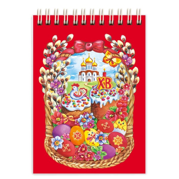 Блокнот пасхальный, на нем изображены: корзина, храм, верба, куличи, цыплята, курица и яйца.