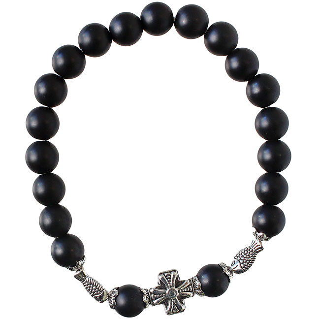Браслет 20 зерен из камня шунгит (с крестом и рыбками)