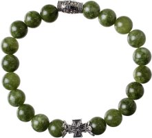 Размеры: длина окружности чёток по внутренней стороне 16 см (без учёта растяжения резинки); диаметр бусины — 0,8 см.