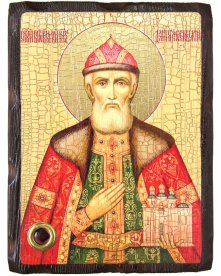 Икона выполнена в технике состаривания. В мощевике кусочек плата, освященного на мощах благоверного князя. На обратной стороне имеется отверстие для крепления.