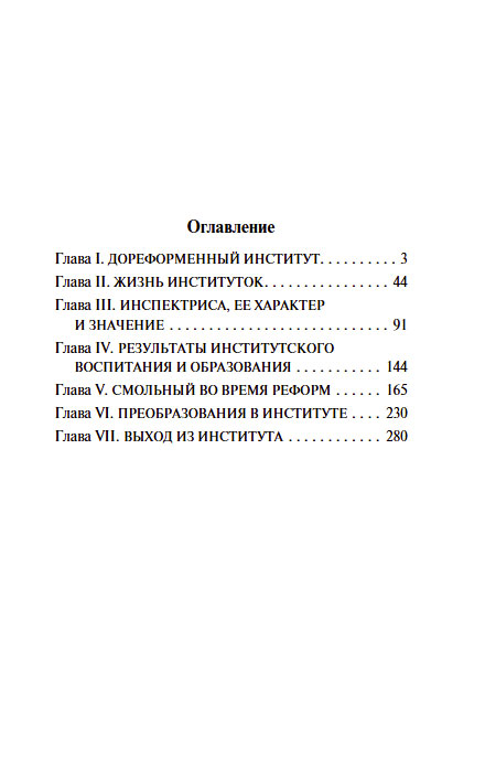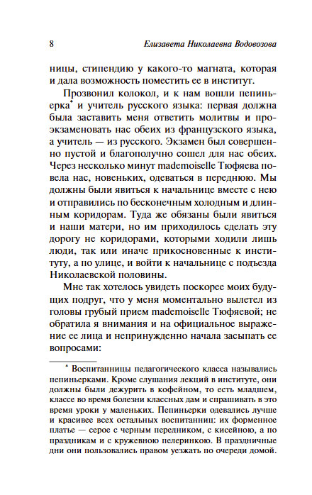 Смольный институт, открытый по приказу Екатерины II, — первое женское образовательное учреждение в России, цель которого «дать государству образованных женщин, хороших матерей, полезных членов семьи и общества». Со временем характер заведения изменился, институт стал замкнутым привилегированным заведением, за чьим красивым фасадом скрывался казарменный режим, а учеба заключалась в бездумной зубрежке. В своем мемуарном очерке Елизавета Водовозова без прикрас описывает институтские нравы: строгость классных дам, традиционную игру в обожание, скудное питание и поверхностное изучение предметов. Описывает образовательную реформу К. Д. Ушинского, которая разбудила в юной смолянке интерес к получению новых знаний и полностью перевернула представление о том, что такое учеба.