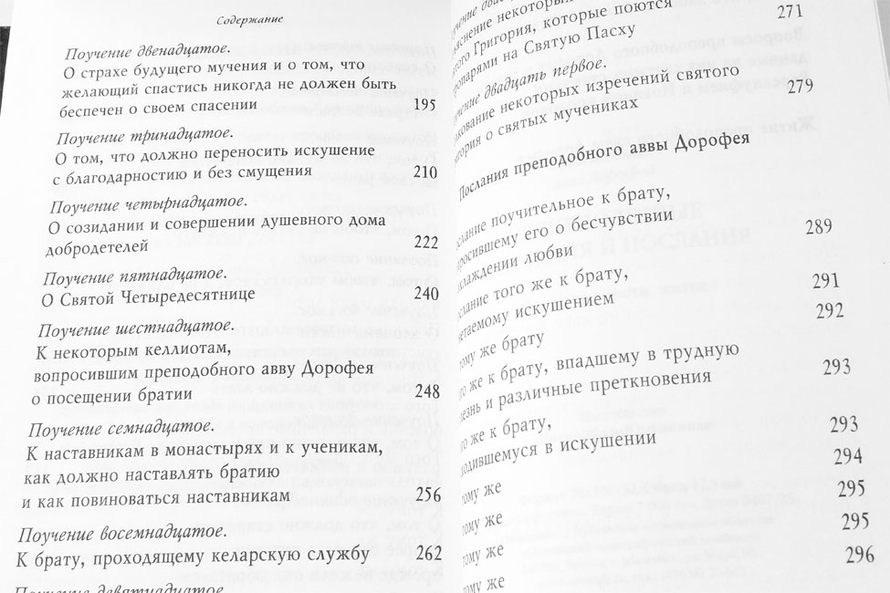 Самым известным произведением преподобного Дорофея является «Душеполезные поучения», эта книга в числе наиболее популярных в России по числу списков, опережают её только «Лествица» да творения Ефрема Сирина. «Поучения» включают в себя рассказ о Досифее — одном из любимых учеников Аввы Дорофея, который беспрекословно слушался своего учителя, за это удостоился венца в Царствии Небесном. Также «Душеполезные поучения» рассказывают о главных добродетелях христианина: смиренномудрии, рассудительности, бесстрастии, непамятозлобии и других, содержат наставления к богоугодной жизни. Книга пропитана искренней любовью Дорофея к ближним, она подходит не только для монахов, но и для живущих в миру.