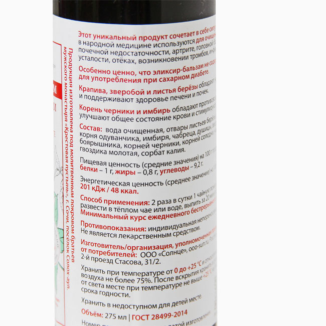 Состав: вода очищенная, отвары листьев березы, крапивы, шиповника, мелиссы, корня одуванчика, имбиря, чабреца, душицы, зверобоя, иван-чая, мяты, плодов боярышника, корней черники, корней солодки, чай черный, корица молотая, гвоздика молотая, сорбат калия.