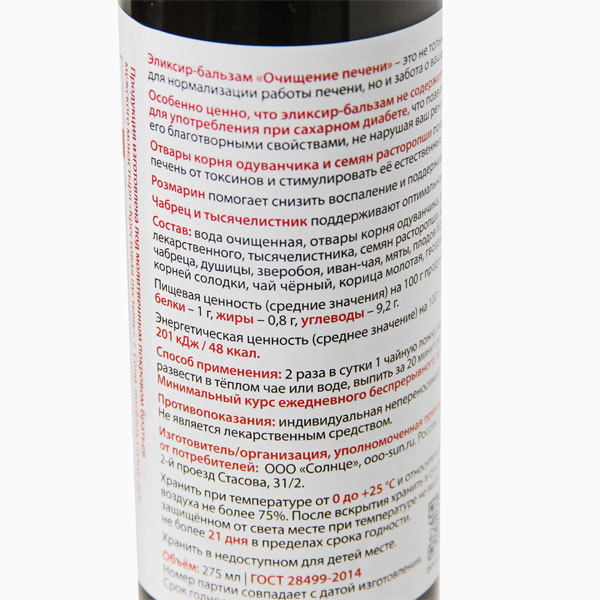 Эликсир-бальзам «Очищение печени» – это не только эффективное средство для нормализации работы печени, но и забота о вашем общем благополучии. Особенно ценно, что эликсир-бальзам не содержит сахар и безопасен для употребления при сахарном диабете, что позволяет вам наслаждаться его благотворными свойствами, не нарушая ваш режим питания. Отвары корня одуванчика и семян расторопши помогают активно очищать печень от токсинов и стимулировать её естественные функции. Розмарин помогает снизить воспаление и поддерживать здоровье печени. Чабрец и тысячелистник поддерживают оптимальное функционирование печени.
