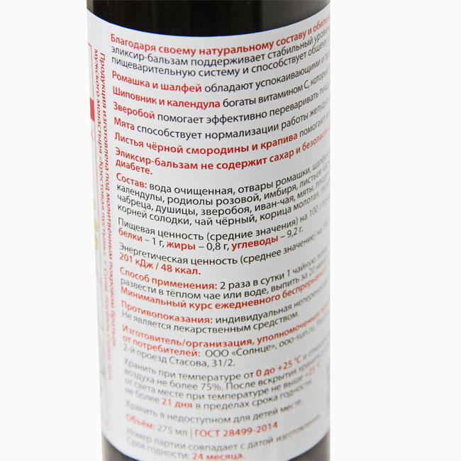 Благодаря своему натуральному составу и обильному содержанию целебных трав, эликсир-бальзам поддерживает стабильный уровень сахара в крови, укрепляет пищеварительную систему и способствует общему оздоровлению организма. Ромашка и шалфей обладают успокаивающими и противовоспалительными свойствами. Шиповник и календула богаты витамином C, который полезен для укрепления иммунитета. Зверобой помогает эффективно переваривать пищу и усваивать питательные вещества. Мята способствует нормализации работы желудка и кишечника. Листья чёрной смородины и крапива помогают выводить токсины из организма. Эликсир-бальзам не содержит сахар и безопасен для употребления при сахарном диабете.