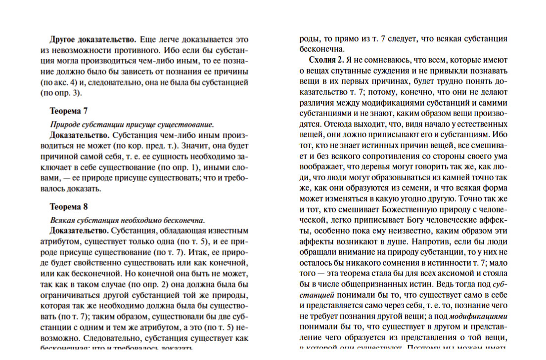 Характерной чертой трактатов Спинозы является строгая последовательность мысли и четкая организация текста. Идеи Спинозы, особенно его центрального произведения, «Этики», оказали мощное воздействие на культуру XVII-XIX столетий: Спинозу любили, читали, толковали, с ним спорили не только такие философы, как Беркли, Юм, Шеллинг, Гегель, но и великие ученые, просветители, поэты — Дидро, Гердер, Гете.