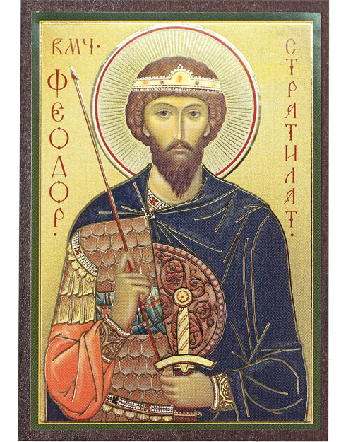 Икона на МДФ, выполненная в технике цветная полиграфия с золотым тиснением. На ней изображен мученик Феодор.