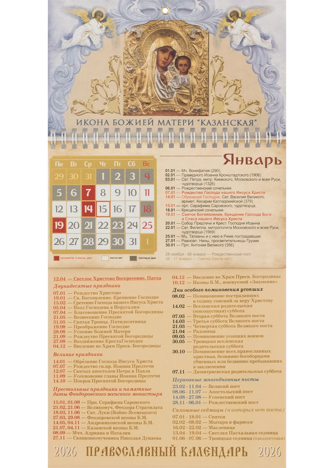 Православный настенный календарь с отрывным блоком на 2026 год содержит икону Божией Матери «Казанская». На каждом листе приводятся даты двунадесятых и великих праздников, а также памяти чтимых святых и образов Пресвятой Богородицы, чье празднование отмечается в текущем месяце. В календарной сетке выделены воскресные, праздничные, постные дни, сплошные седмицы и дни особого поминовения усопших.