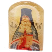 Икона настольная на подставке выполнена путем технологии фотопечати на камне под лаком.