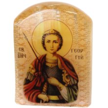 Икона настольная на подставке выполнена путем технологии фотопечати на камне под лаком.