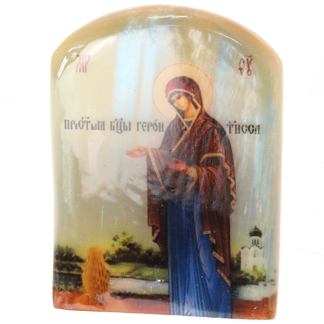 Икона настольная на подставке выполнена путем технологии фотопечати на камне под лаком.