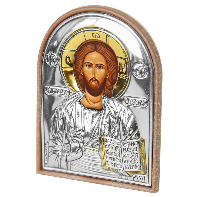 Икона выполнена на основе из пластика, имеет подставку. Лицевая часть оклада плакирована листовым серебром. Лик - шелкография.