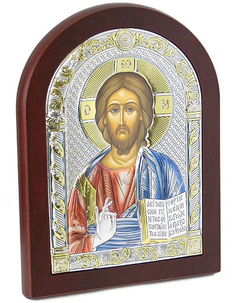Икона ручной работы. Лик иконы изготавливается полностью, включая рисунок иконы под окладом. Используется метод шелкографии, а также трафаретной объемной печати. Оклад изготовлен из листа алюминия с поверхностной обработкой с помощью PVD технологии нанесения тонкого слоя серебра. На обратной стороне иконы имеется отверстие (для крепления к стене) и подставка, а также сертификат.