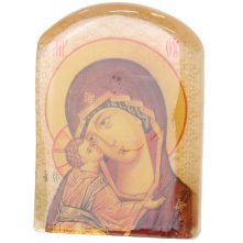 Икона настольная на подставке выполнена путем технологии фотопечати на камне под лаком.