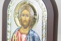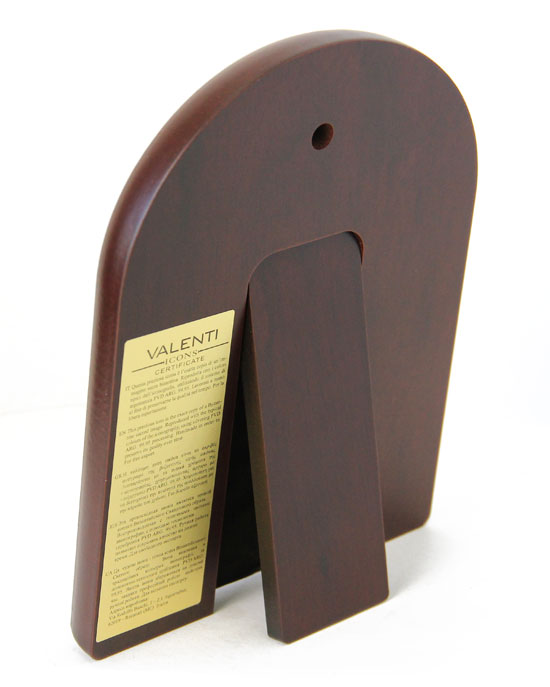 Икона ручной работы. Лик иконы изготавливается полностью, включая рисунок иконы под окладом. Используется метод шелкографии, а также трафаретной объемной печати. На оборотной стороне иконы имеется отверстие (для крепления к стене) и подставка, а также сертификат подлинности печати.
