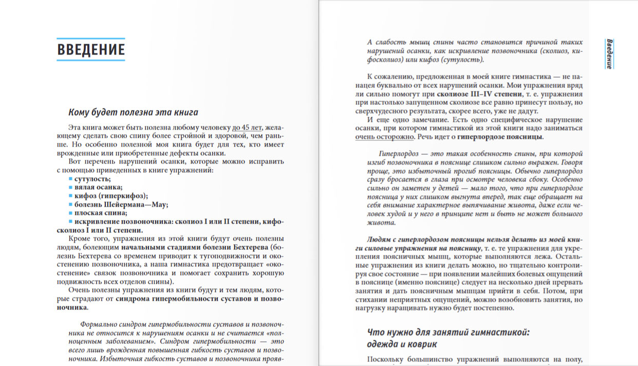 Предложенный в книге комплекс упражнений может быть полезен любому человеку, желающему сделать свою спину более стройной и здоровой, чем раньше. Но особенно полезной книга будет для тех, кто имеет врожденные или приобретенные нарушения осанки: сутулость, вялая осанка, кифоз (гиперкифоз), болезнь Шейермана—Мау, плоская спина, искривление позвоночника (сколиоз, кифосколиоз), а также для болеющих начальными стадиями болезни Бехтерева и синдромом гипермобильности суставов и позвоночника.С помощью этой гимнастики можно простыми и понятными способами за определенное время исправить свою осанку. Все, что вам нужно — только внимательность и усердие в выполнении упражнений.