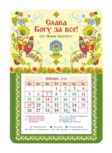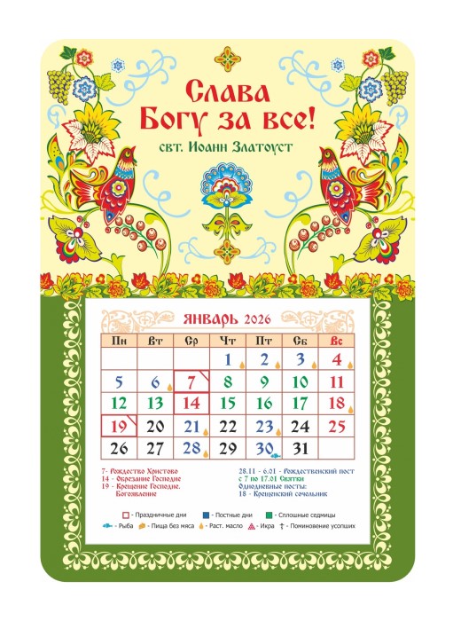 Гибкий магнитный календарь. В календаре выделены постные, воскресные и праздничные дни, сплошные седмицы, дни особого поминовения усопших, а также дни, в которые на трапезе разрешается рыба, икра, растительное масло.