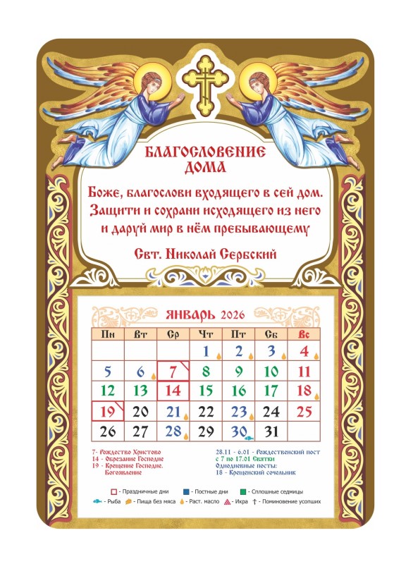 Гибкий магнитный календарь с отрывным численником. В календаре выделены постные, воскресные и праздничные дни, сплошные седмицы, дни особого поминовения усопших, а также дни, в которые на трапезе разрешается рыба, икра, растительное масло.