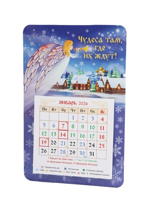 Гибкий магнитный календарь с отрывным численником. В календаре выделены постные, воскресные и праздничные дни, сплошные седмицы, дни особого поминовения усопших, а также дни, в которые на трапезе разрешается рыба, икра, растительное масло.