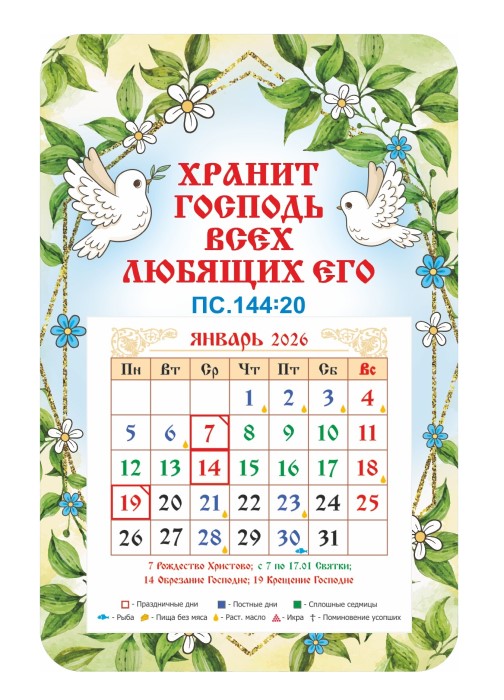 Гибкий магнитный календарь с отрывным численником. В календаре выделены постные, воскресные и праздничные дни, сплошные седмицы, дни особого поминовения усопших, а также дни, в которые на трапезе разрешается рыба, икра, растительное масло.