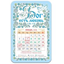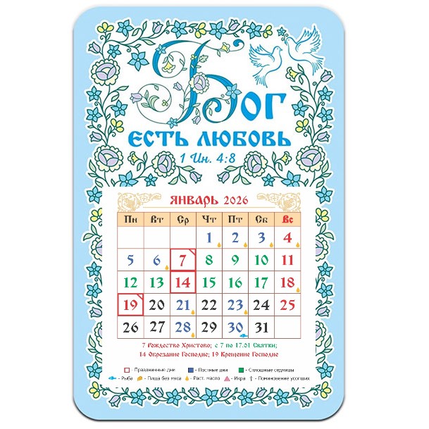 Гибкий магнитный календарь с отрывным численником. В календаре выделены постные, воскресные и праздничные дни, сплошные седмицы, дни особого поминовения усопших, а также дни, в которые на трапезе разрешается рыба, икра, растительное масло.