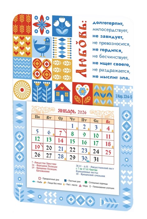 Гибкий магнитный календарь. В календаре выделены постные, воскресные и праздничные дни, сплошные седмицы, дни особого поминовения усопших, а также дни, в которые на трапезе разрешается рыба, икра, растительное масло.