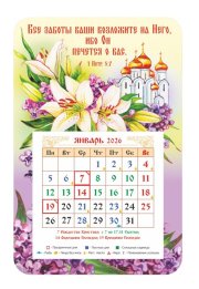 Гибкий магнитный календарь с отрывным численником. В календаре выделены постные, воскресные и праздничные дни, сплошные седмицы, дни особого поминовения усопших, а также дни, в которые на трапезе разрешается рыба, икра, растительное масло.