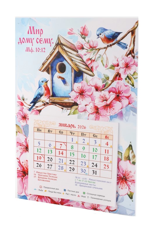Картонный календарь на магните с отрывным численником. В календаре выделены постные, воскресные и праздничные дни, сплошные седмицы, дни особого поминовения усопших, а также дни, в которые на трапезе разрешается рыба, икра, растительное масло.