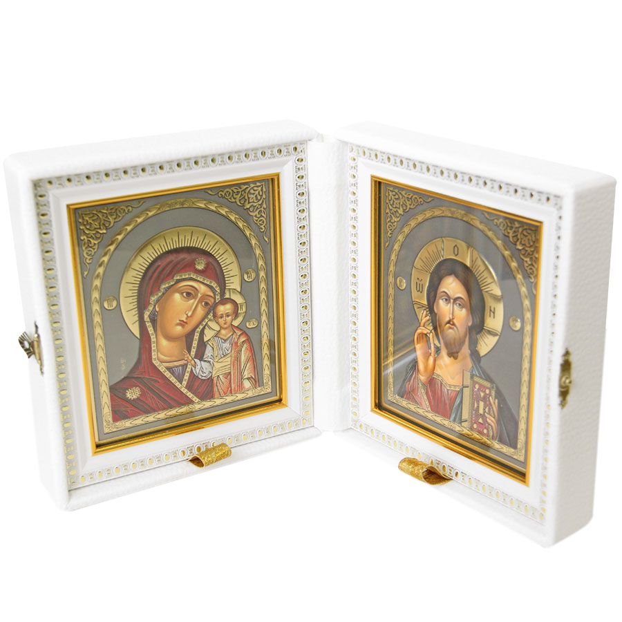 Складень ручной работы «Венчальная пара» с иконами Божия Матерь «Казанская» и «Господь Вседержитель». Венчальной парой благословляют жениха и невесту, вступающих в брак.