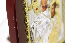 Материал: оклад — серебряная фольга на алюминиевой основе; гальваника. Основа — МДФ, лак.