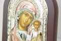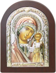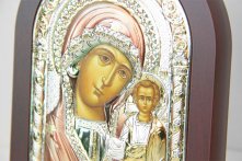 Икона ручной работы. Лик иконы изготавливается полностью, включая рисунок иконы под окладом. Используется метод шелкографии, а также трафаретной объемной печати. На обратной стороне иконы имеется отверстие (для крепления к стене) и подставка, а также сертификат подлинности печати.