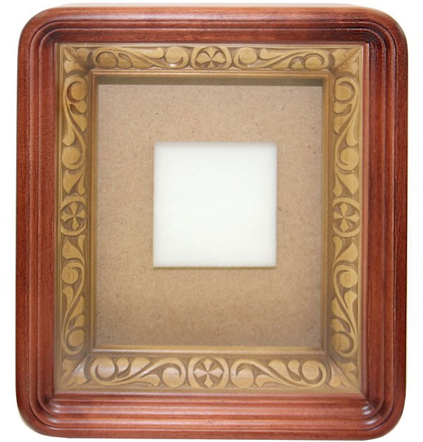 Киот аналойный. Внутреннее обрамление украшено художественным орнаментом (ручная работа). В киот вставлено стекло, которое в случае порчи можно заменить самостоятельно. Сзади имеет отверстие, чтобы повесить на стену.