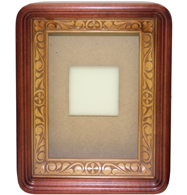 Киот аналойный. Внутреннее обрамление украшено художественным орнаментом (ручная работа). В киот вставлено стекло, которое в случае порчи можно заменить самостоятельно. Сзади имеет отверстие, чтобы повесить на стену.