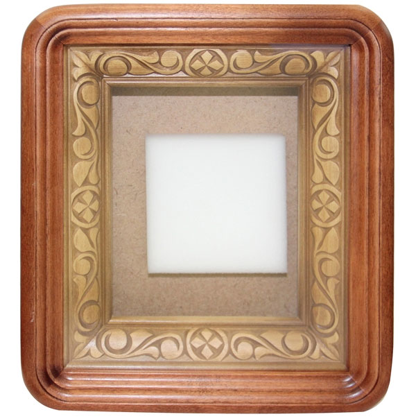 Киот аналойный. Внутреннее обрамление украшено художественным орнаментом (ручная работа). В киот вставлено стекло, которое в случае порчи можно заменить самостоятельно.