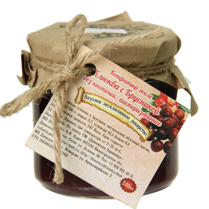 Состав: ягоды клюквы и брусники, натуральный яблочный пектин, сахар-песок.