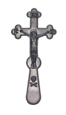 Крест погребальный с темным распятием, используется при погребении усопшего. На обратной стороне креста имеется надпись «Господи Помилуй».