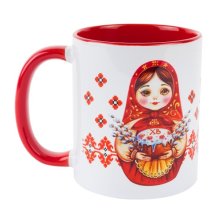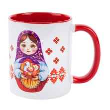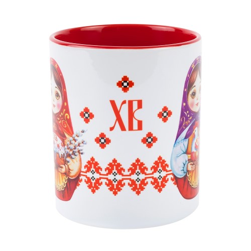 Кружка керамическая в подарочной упаковке. Описание: кружка украшена орнаментом, имеется надпись «ХВ» и изображены две матрешки.