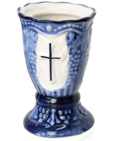 Керамическая лампада украшена объёмным рисунком виноградной грозди с листочком и фигурной верхней частью. Поверхность лампады покрыта цветной глазурью.