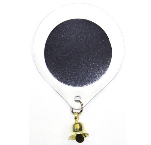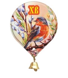 Выполнен в форме капельки и украшен колокольчиком, имеется изображение Зарянки и надпись «ХВ».