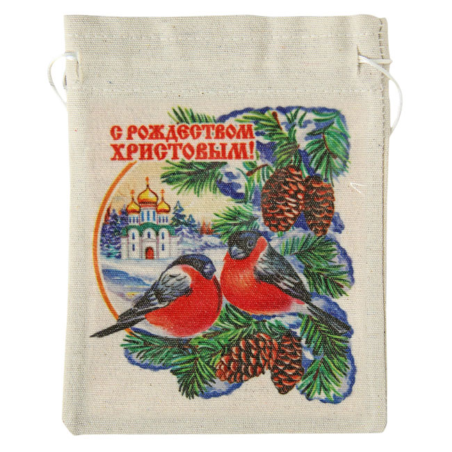 Мешочек для рождественских подарков «Снегири и храм» (лен, 12 х 18 см)