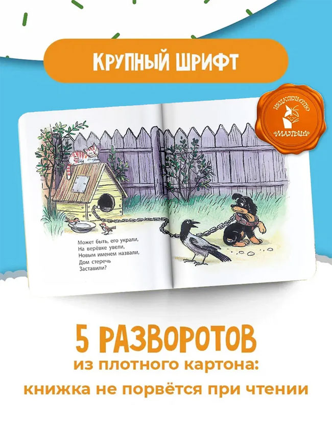 Эта книга предназначена именно для малышей: в ней яркие рисунки и крупные буквы, плотный картон не порвется при чтении, а скругленные уголки не повредят маленькие пальчики.