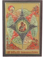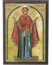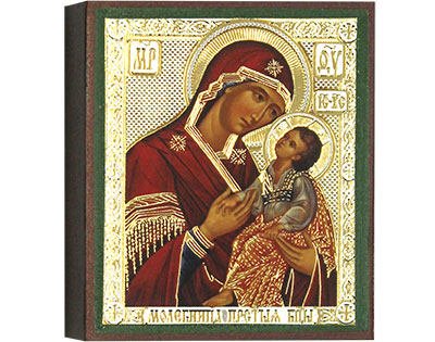 Замечательный образ в хорошем исполнении, редко встречается. Называется «Мати Молебница». Праздник в 7-ю Неделю после Пасхи. Прославлен недавно, но к нему уже есть акафист, тропарь, молитва. Основа крепкая, не сыплется, наклейка толстая, не голая бумажка, а с покрытием, которое надёжно защищает от влаги и времени.