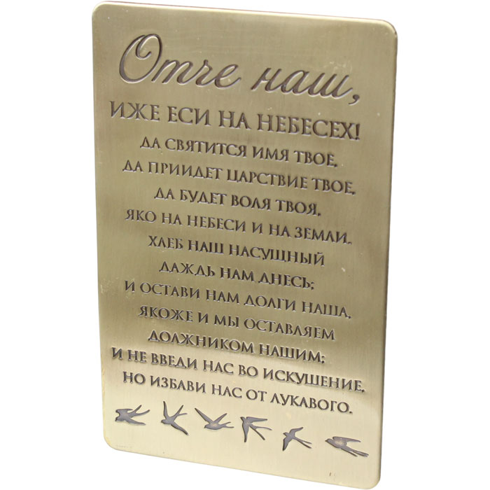 Молитва для ношения с собой "Отче Наш": "Отче наш, Иже еси на небесех! Да святится имя Твое, да приидет Царствие Твое, да будет воля Твоя, яко на небеси и на земли. Хлеб наш насущный даждь нам днесь; и остави нам долги наша, якоже и мы оставляем должником нашим; и не введи нас во искушение, но избави нас от лукаваго. Аминь".