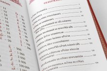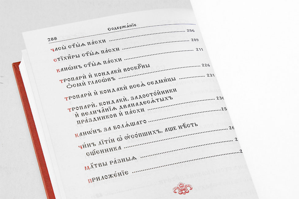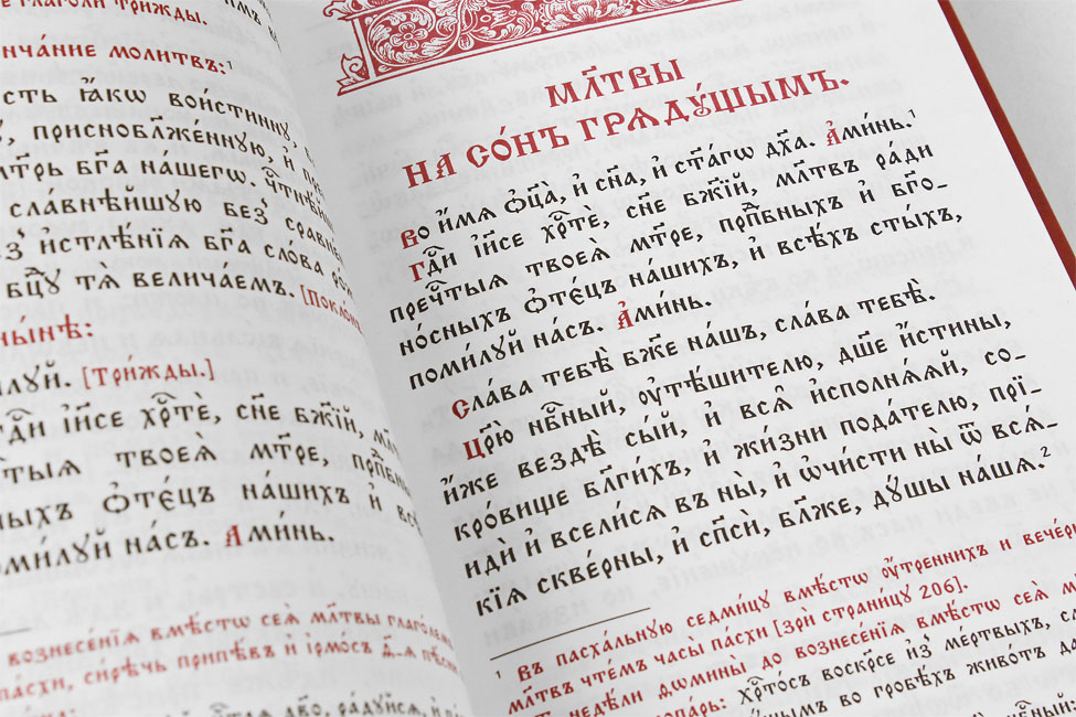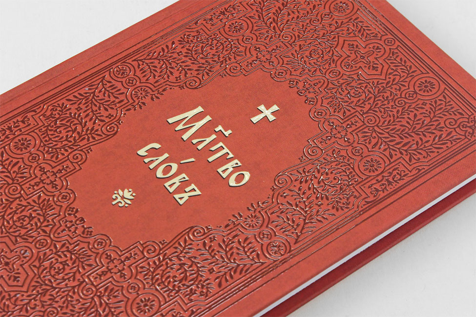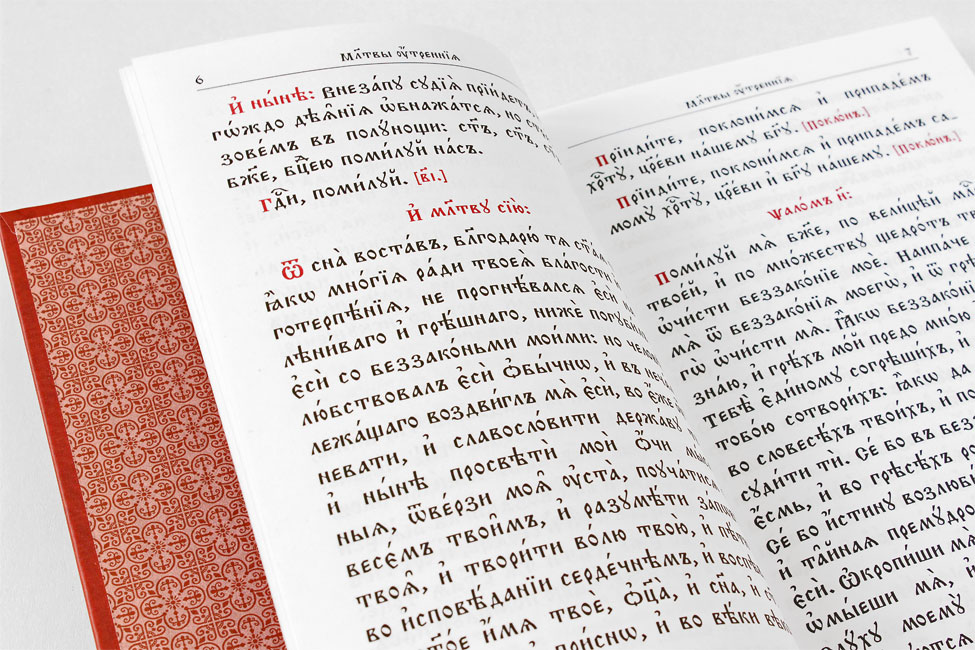 Молитвослов на церковнославянском языке, отпечатан на высококачественной белой офсетной бумаге двухцветным крупным шрифтом, в твёрдой обложке, покрытой объёмным лаком.